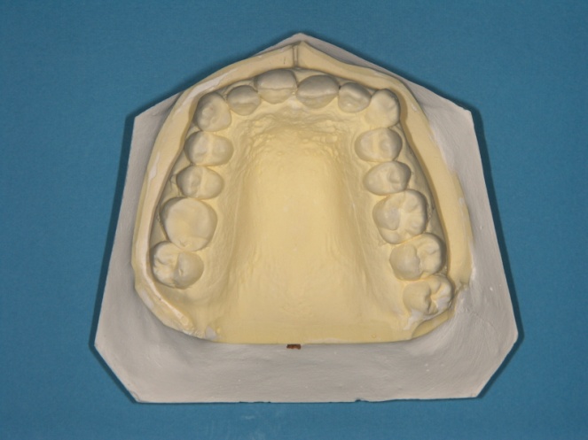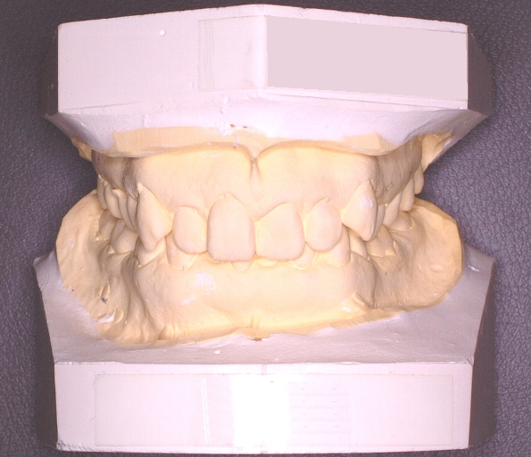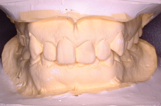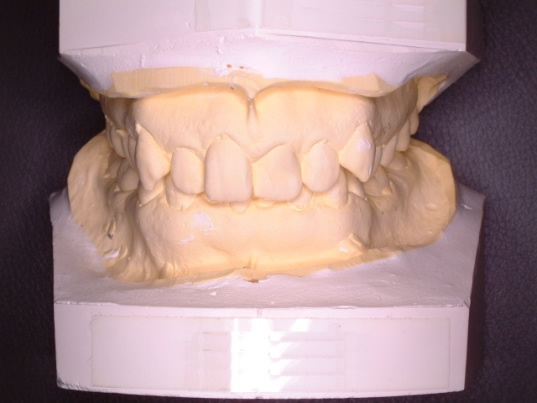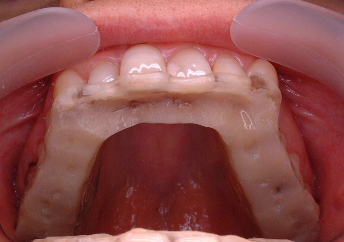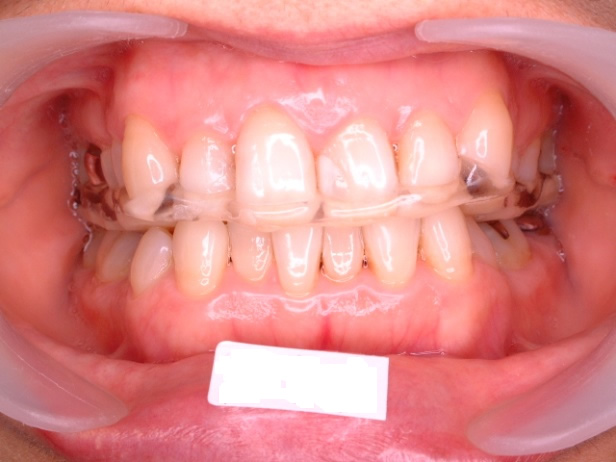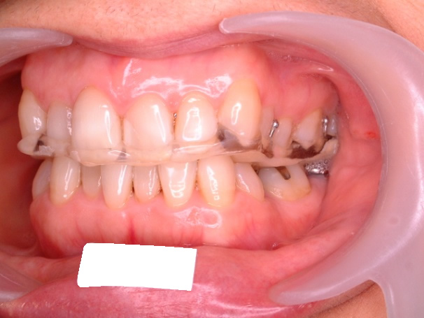 | スタビリゼーションタイプのスプリントを装着し筋の異常緊張の是正と咀嚼筋群の安静を得る.少し緊張が取れたところで、顎位の矯正を行うため下顎を前方誘導するための斜面板付きのスプリントを装着。下顎を前方へ誘導し過蓋咬合の改善を行う | ||