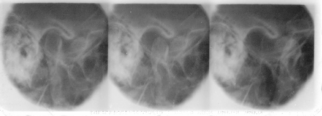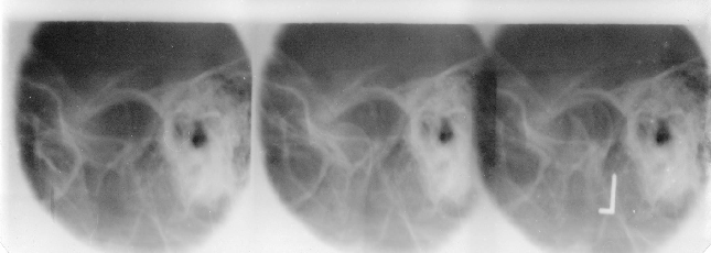 | スプリント装着時のパノラマX線写真。左右上顎智歯と,右側下顎埋伏智歯が確認される。顎関節X写真では、咬頭嵌合位で両側共に関節頭の位置が後上方にあるスプリント装着時には、前下方へ移動 | ||