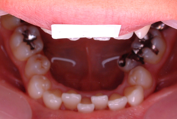 | 矯正開始より7ヶ月 下顎スプリントの左右6,7番を切断除去し挺出させる | ||
