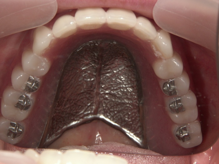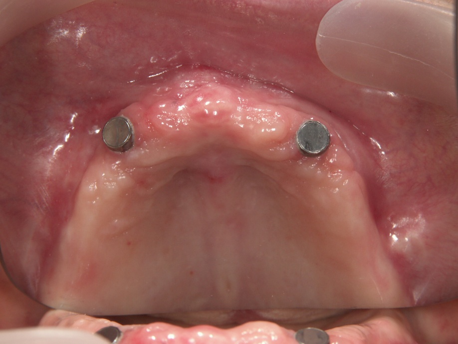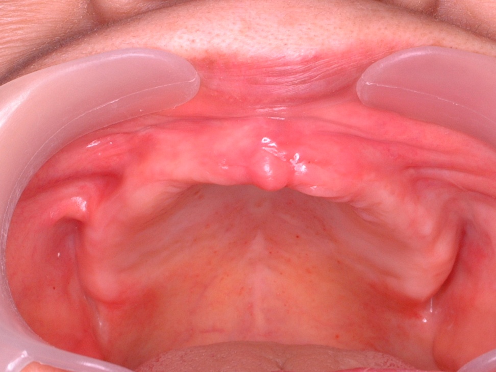 | 上顎は2本のインプラントで、義歯を維持する事としました。下顎は、左側が欠損であるが、骨の高さがなく骨増生に時間が掛かる為、目立たないフレキサイトデンチャーを希望されました。 右側は臼歯部が保存不可能で抜歯し、右側のみインプラントとしました。 |