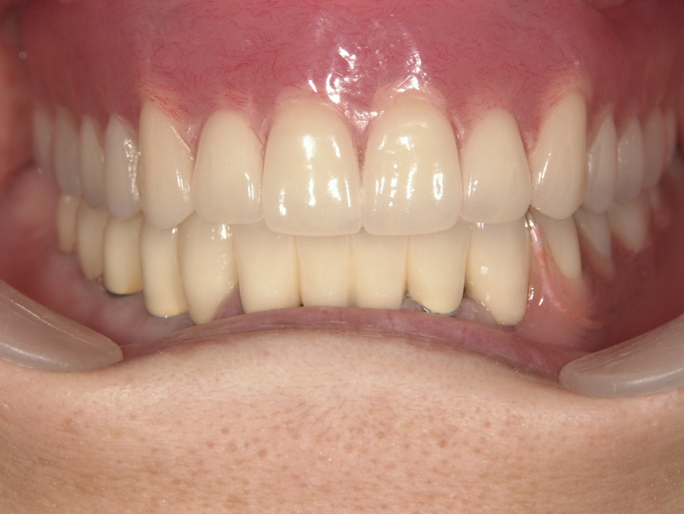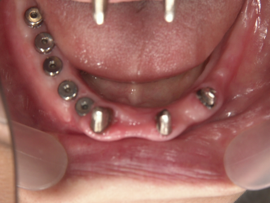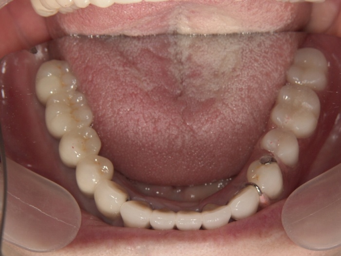 インプラント手術後、上顎は入歯を支えるために2本、下顎は、右に5本、左は骨の吸収が重度の為、フレキサイトデンチャーにしました。下顎の前歯はご本人の希望で残しポーセレンのブリッジを作製しました。