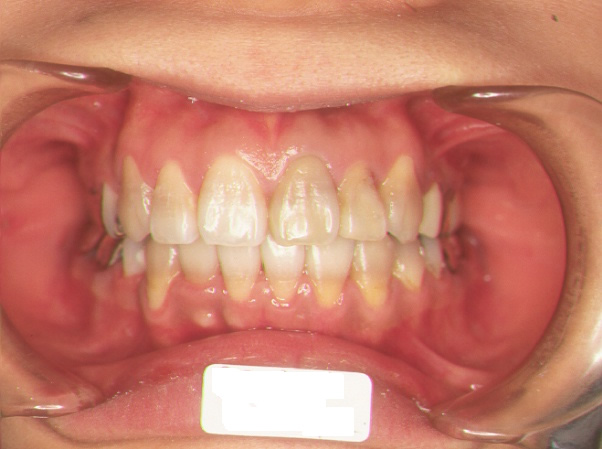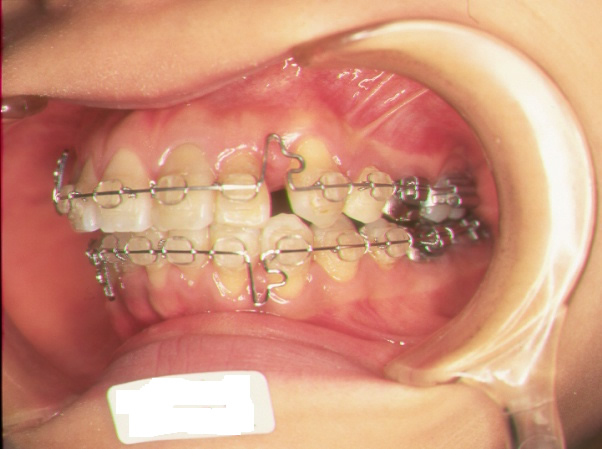 | 97/6/13 分析の結果上下共に顎の長さより、歯の並ぶ長さのほうが長かったため左右上下の第一小臼歯を抜歯して、犬歯の動くスペースを作り、歯並びを整えています。 | ||